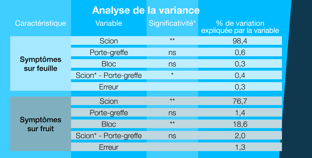 Une technique statistique connue sous le nom d'analyse de la variance (ou ANOVA) a été utilisée pour évaluer quelles variables ci-dessus étaient significatives dans l'expression différente des symptômes du ToBRFV dans les 50 combinaisons possibles de variétés et de porte-greffes.